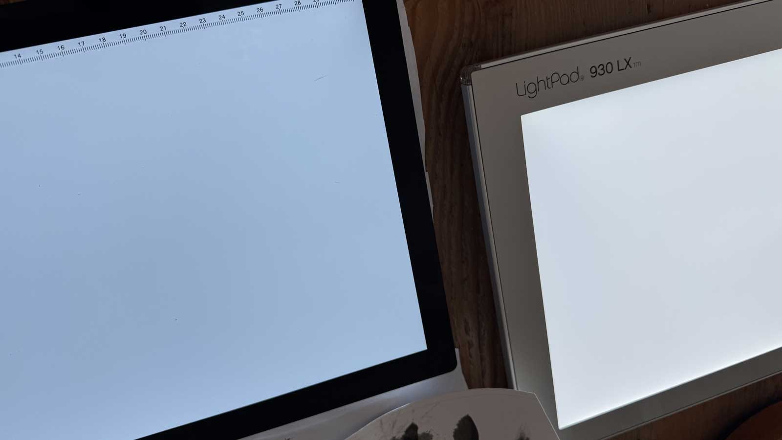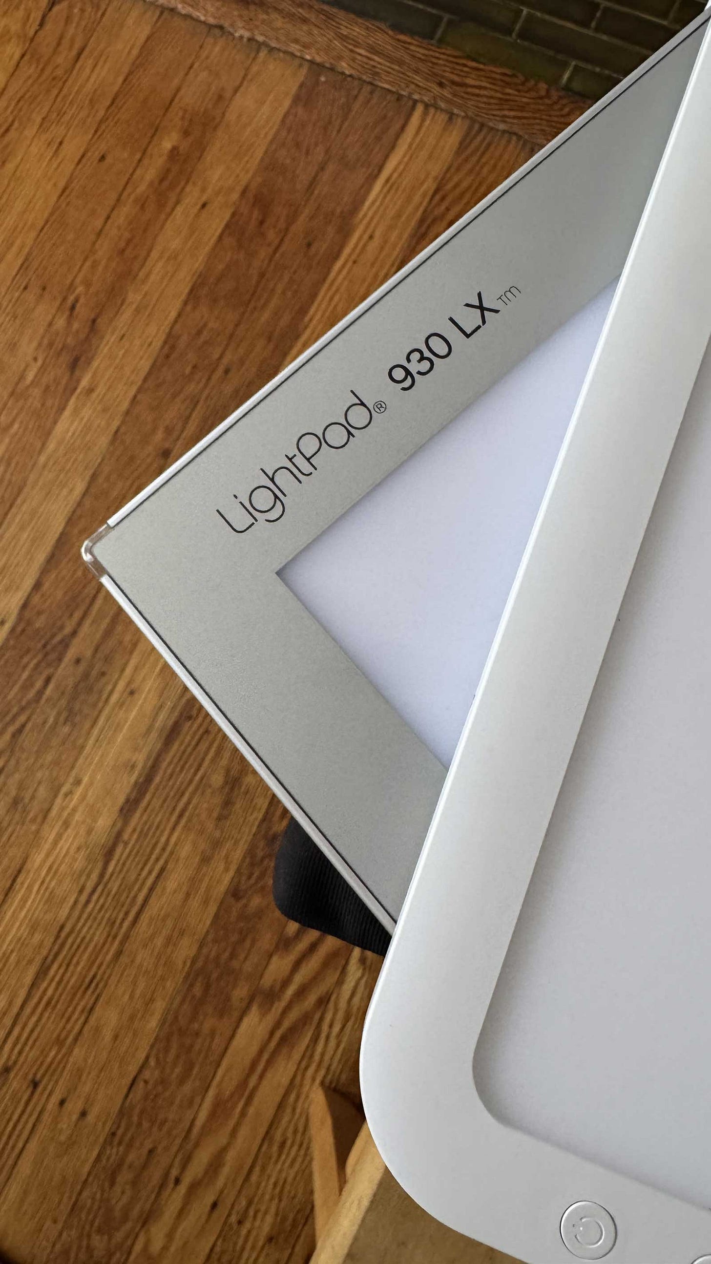 The Artograph LightPad 930 LX is 500 to 5500 Lux adjustable, 6-7K cool white (not great for working at night), 12x9, wired only, $146.97. A relative no-name (Zocelight) is 2660 to 8860 Lux adjustable, warm temperature available, also 12x9, wired and battery, $29.99. To be honest the cheaper one works great. I love that it provides a warm temp option and doesn’t need to be plugged in. It has a ridge which may bother some but I ended up using it for registration and it kept cards from sliding off when working at an angle.