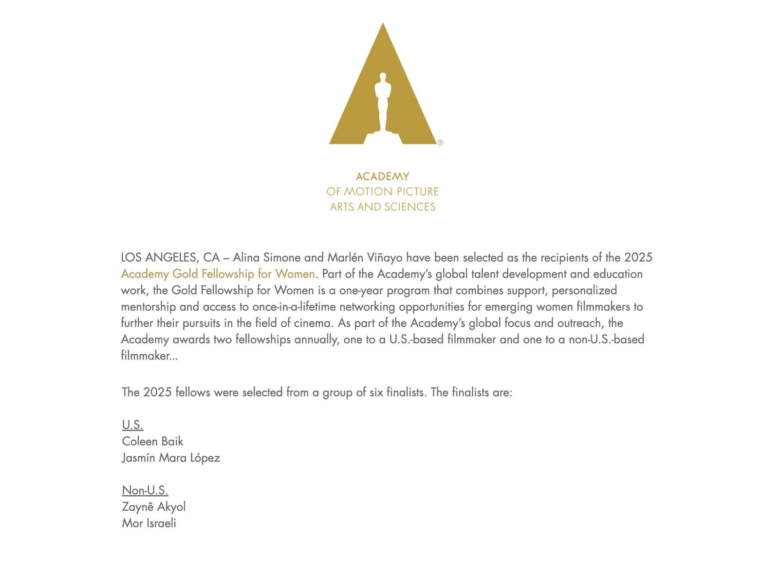 I can now share why: I was nominated for the Academy’s Gold Fellowship for Women back in March. In June I was notified that I’d advanced to the semifinals and would I please provide a formal pitch. In August, I received news that I was one of the finalists. In September, fellowships were awarded by the Academy of Motion Picture Arts and Sciences to one U.S.-based, and one non-U.S., woman filmmaker. Spoiler: I did not receive the U.S. fellowship (and the $35,000 that comes with it), but as one of the final contenders I will get matched with an Academy mentor in 2026.
