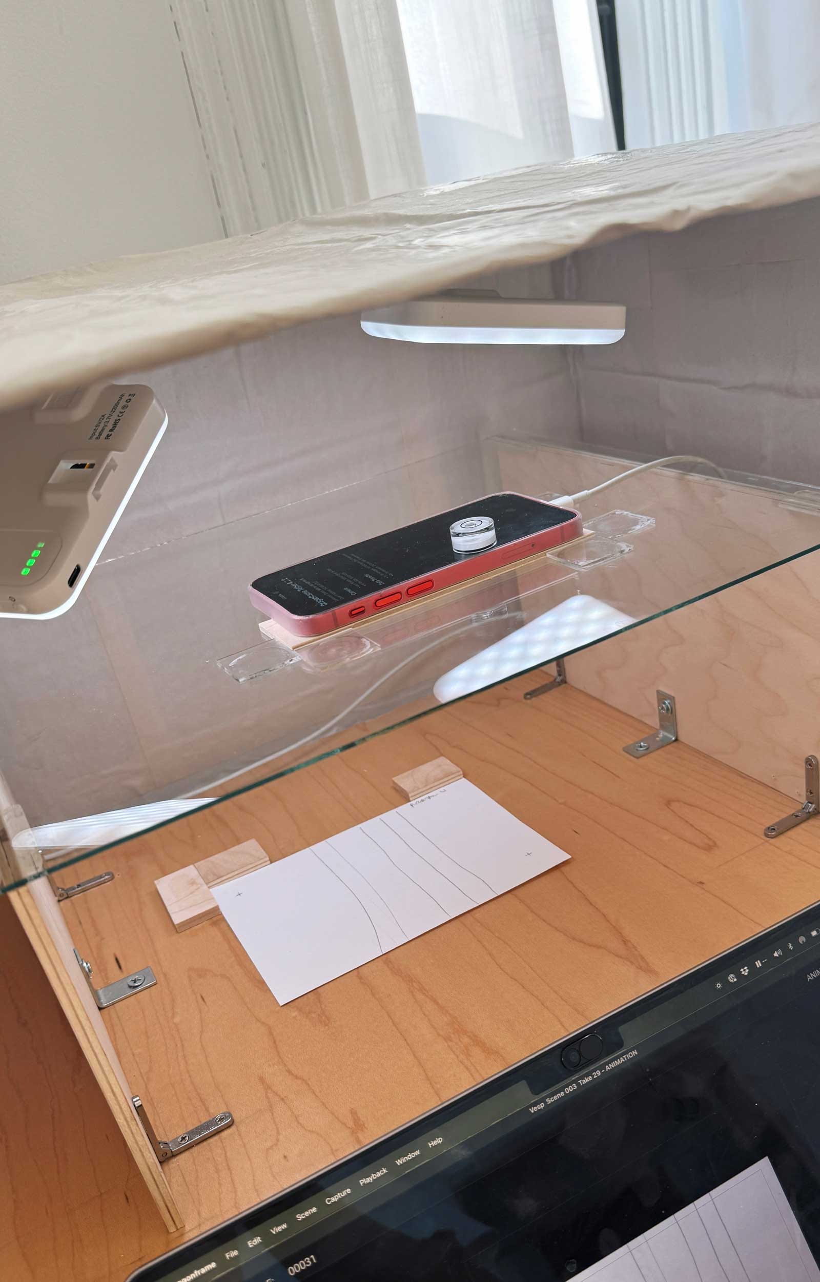 I’m iterating on my downshooting setup for the umpteenth time. Working with paper is laborious and just frickin hard compared to how I’m used to animating (TVPaint software) but I want to see how I, and the work, could evolve through it. So I’ve been doubling down to make the mechanics as ergonomic and joyful to use as possible.