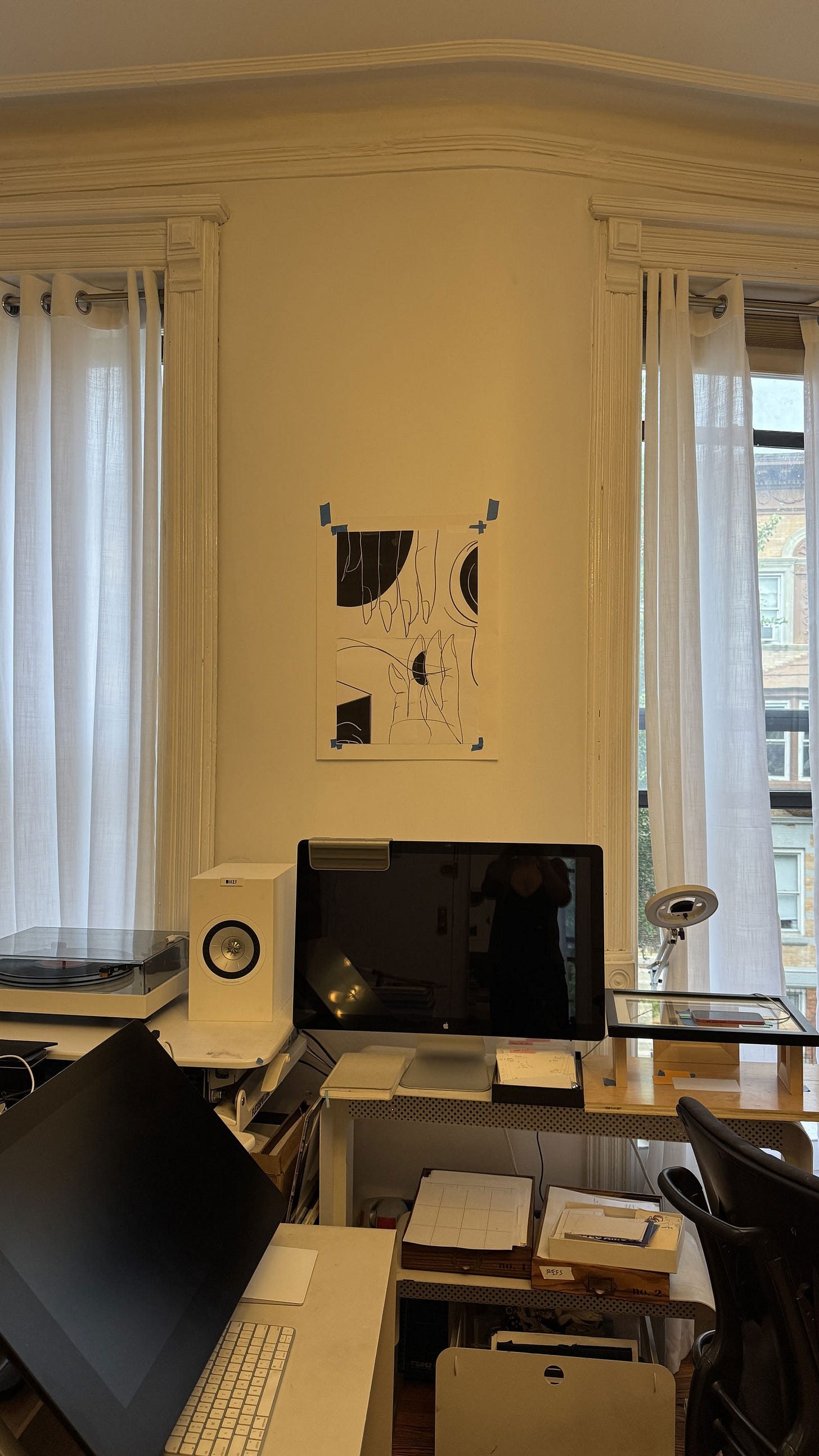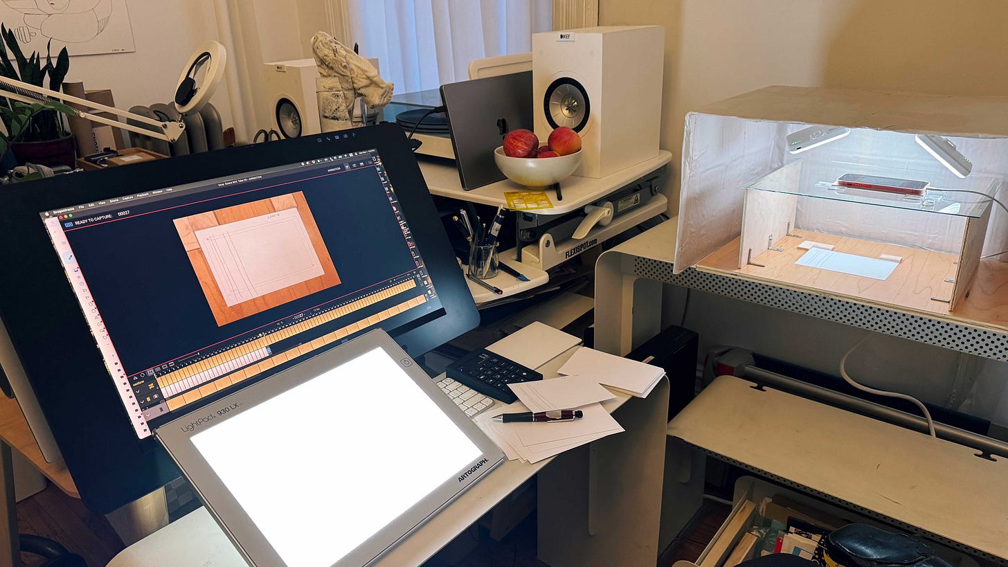 I got rid of an old Cinema Display (RIP) to make room for the downshooter and I can now easily swivel between the Cintiq and the new setup. In addition to being a digital drawing tablet, the Cintiq (which is height and angle-adjustable) is now also: main display, writing desk, drawingboard, and lightbox rest as needed:
