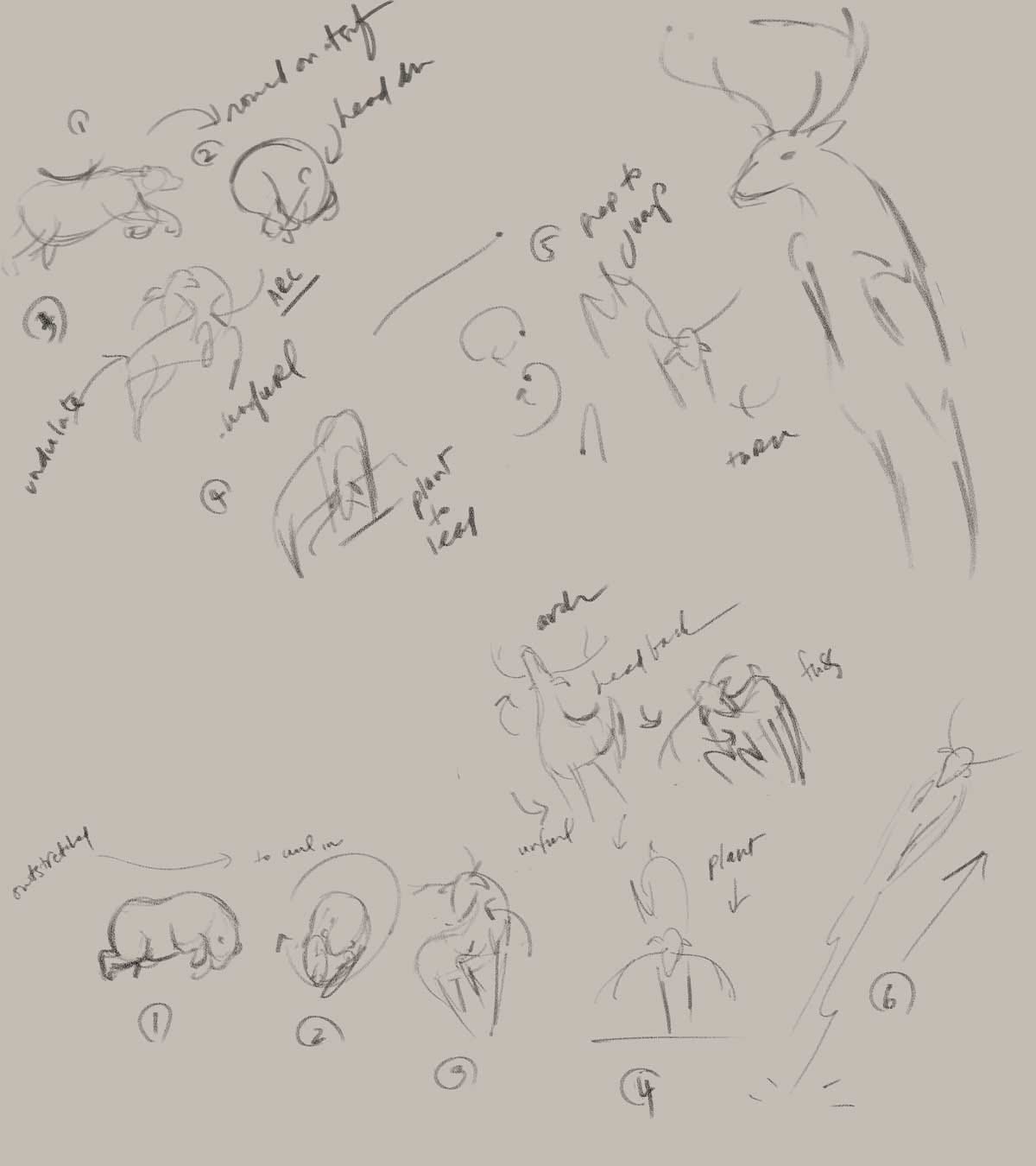 I did some anatomy and run-cycle studies, then brainstormed transition ideas: