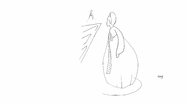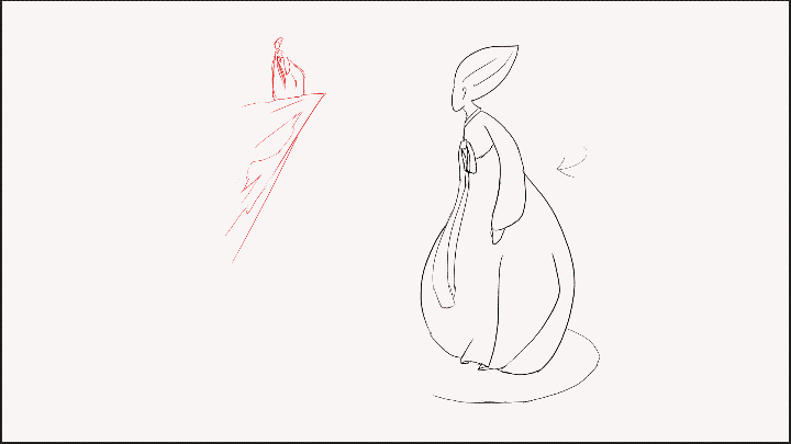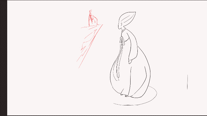 Last two weeks I worked on six different vignettes for the film; I’ll focus on just one here, Chasm. Two women wearing hanbok (traditional Korean dress), gazing at each other over a divide.