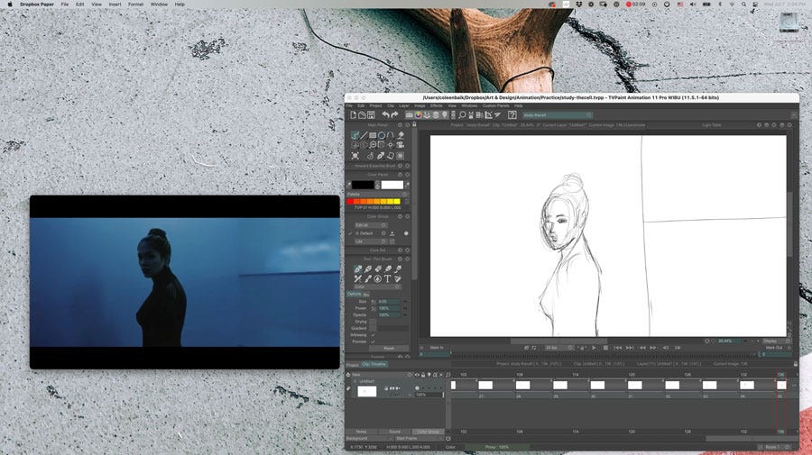 This next one was good for studying timing and the movement of fabric and hair. I went in 4 frame increments and tried to draw what I saw, without tracing. I went loose and fast, not sweating the details.